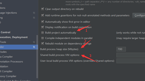 如上图所示,定位到“ Build,Execution,Deployment > Complie ”页面,通过勾选 标注1 所示的Build project automatically,咱们可以设置 IntelliJ IDEA 进行自动编译;标注2 表示设置编译heap大小,默认为 700,如果使用 64 位的机器,在内存足够的情况下,可以尝试修改为 1500 或以上,此外,如果咱们在编译的时候报出OutOfMemoryError的错误,也可以来修改(减小)这个参数;标注3 表示设置编译时的虚拟机参数,这个可以根据需求进行个性化设置,一般情况下,默认就可以。