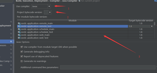 如上图所示,咱们定位到“ Build、Execution、Deployment > Compiler > Java Compiler ”页面,标注1 所示为 IntelliJ IDEA 支持的编译器,包括 Javac、Eclipse、Ajc 等,默认是 Javac,也推荐使用 Javac;标注2 所示为针对项目字节码编译版本,一般选择的是当前项目主 JDK 的版本;标注3表示可以针对Project下各个Module的特殊需求单独设置不同的bytecode version,当然,前提是咱们的电脑上必须事先安装对应的 JDK 版本。