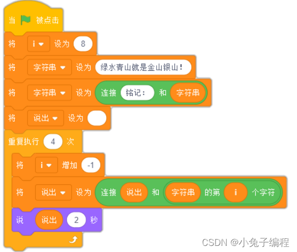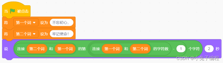 考点分析:考查积木综合使用,重点考查字符串积木,第一个词和第二个词都是5个字符,连起来是:”牢记使命!不忘初心.“,字符数=10-1=9,第9个字符为心,所以答案D