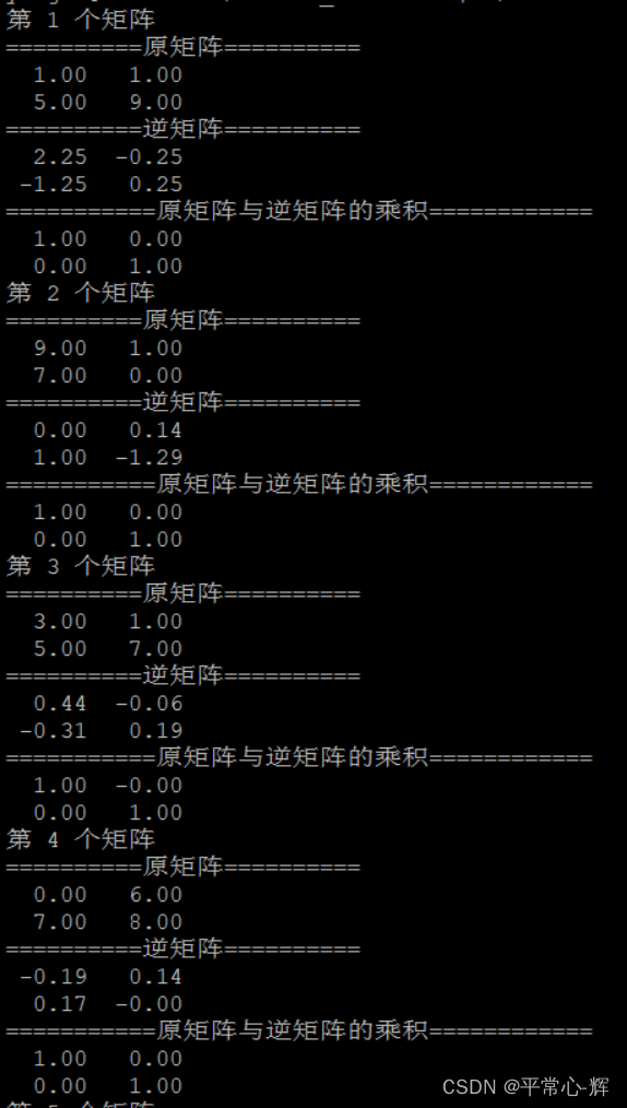 /*for(i = 0 ; i < k ;i++){for(j = 0 ;j < k ;j++){c[i][j] = 0;}}*/for( i = 0; i < k;i++){for( j = 0;j < k ;j++){for( p = 0 ; p < k;p++){value1 += a[i][p] * b[p][j];}c[i][len++] = value1;value1 = 0;if(len == k){len =0;} } } //打印矩阵乘法的结果printf("====================原矩阵与逆矩阵的乘积================\n");for(int i = 0; i < k;i++){for(int j = 0;j < k ;j++){printf("%6.2f ",c[i][j]);} printf("\n");}free(c);