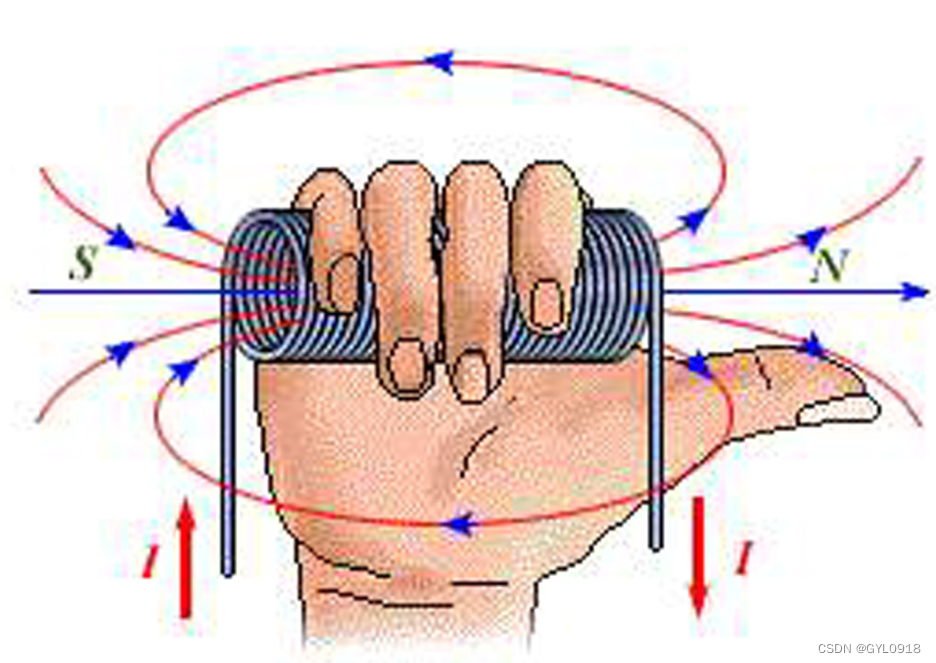 通电螺线管中的安培定则(安培定则二):用右手握住通电螺线管,让四指指向电流的方向,那么大拇指所指的那一端是通电螺线管的N极。