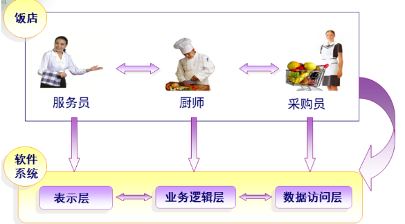 他们各负其职,服务员不用了解厨师如何做菜,不用了解采购员如何采购食材;厨师不用知道服务员接待了哪位客人,不用知道采购员如何采购食材;同样,采购员不用知道服务员接待了哪位客人,不用知道厨师如何做菜。