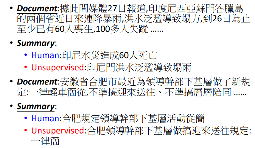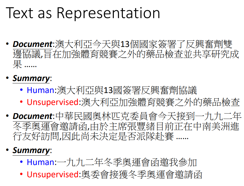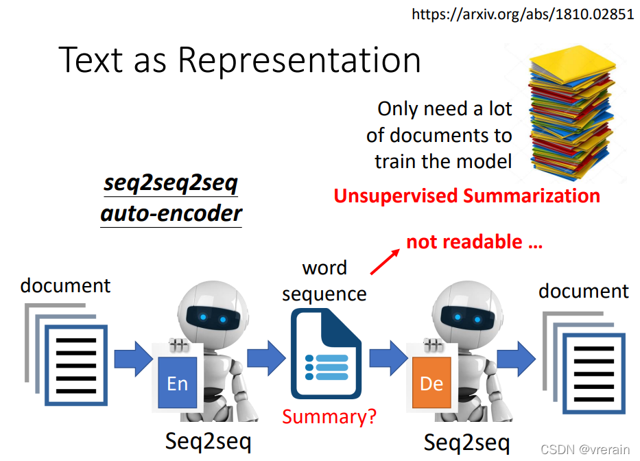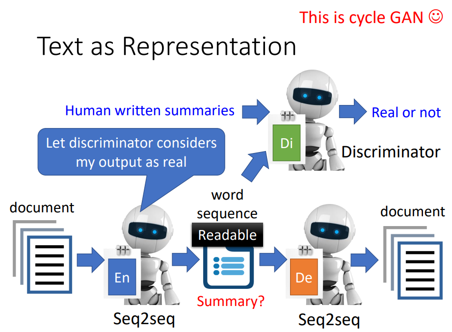 在Text as Representation中,有没有可能Encoder的输出是一段文字,就是文章的摘要。下图是一个seq2seq2seq的auto encoder,但是实际上,Encoder的输出是不可读的。所以可以加上一个GAN网络,来控制输出与人写的句子相似。