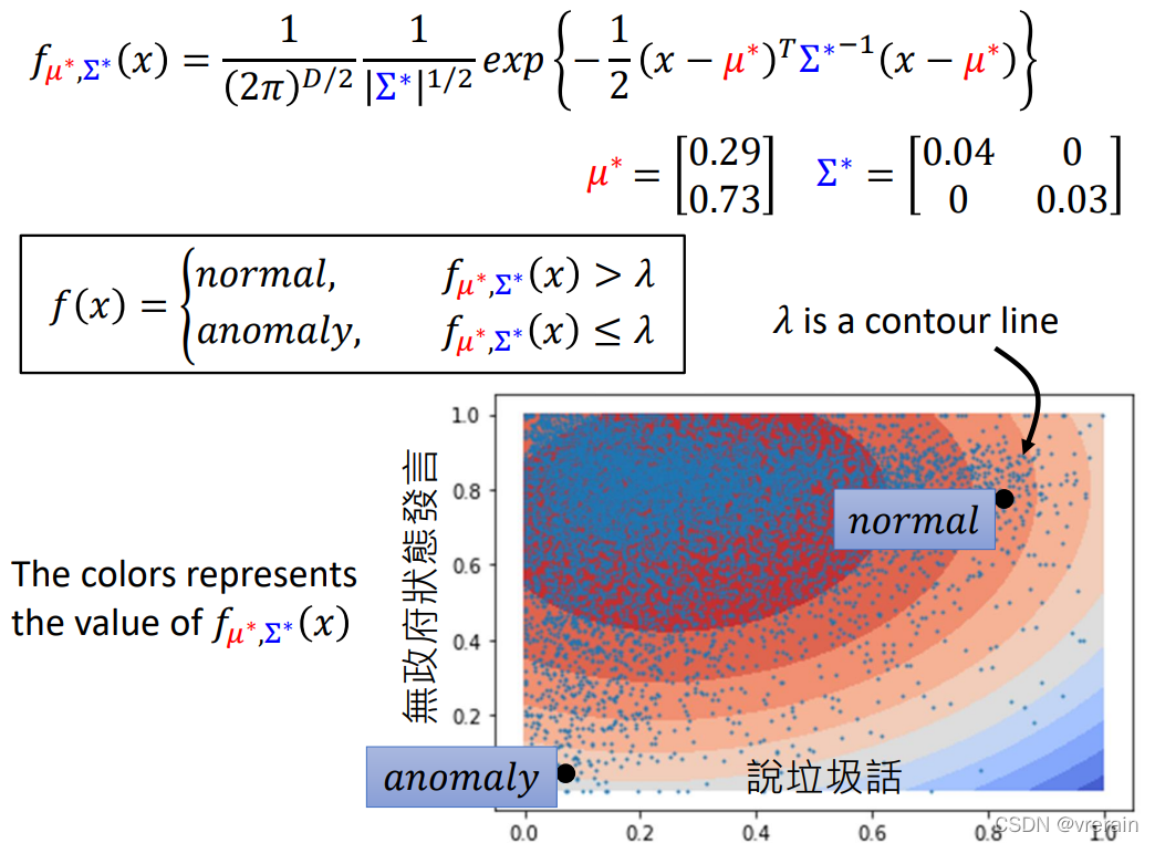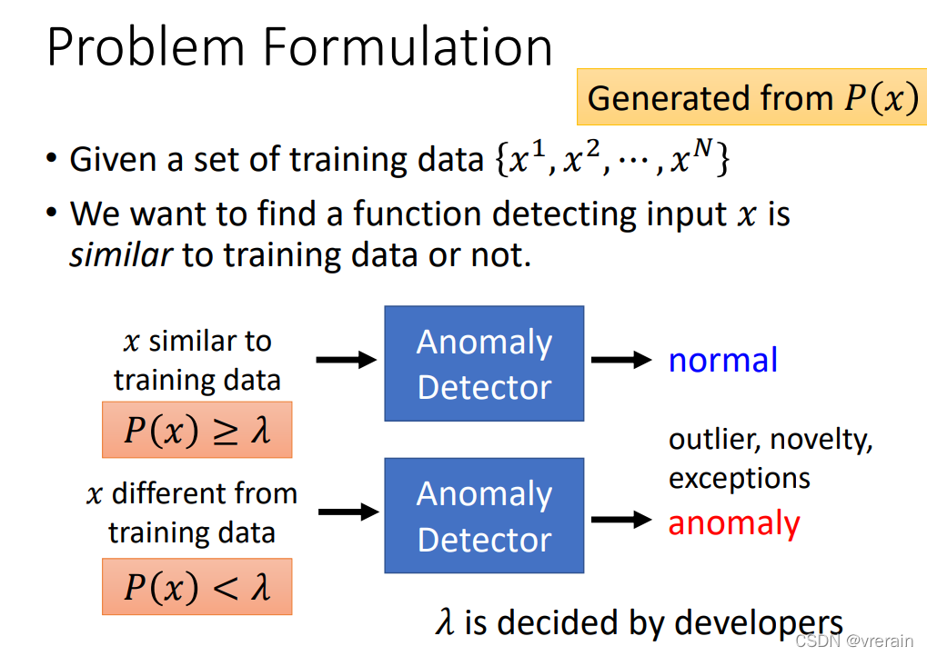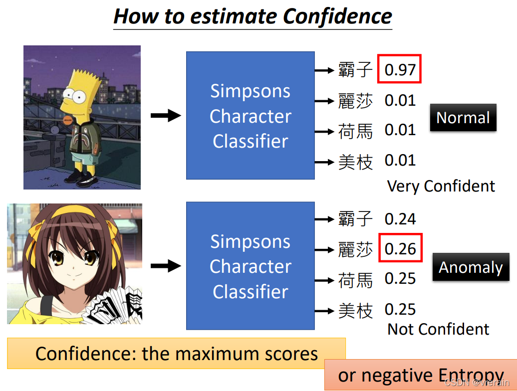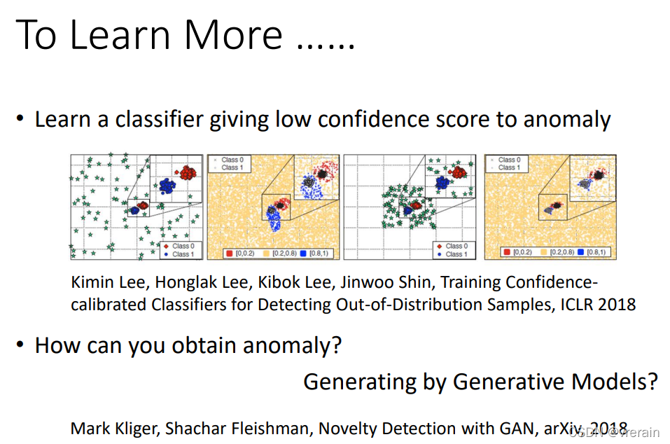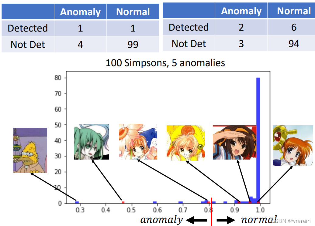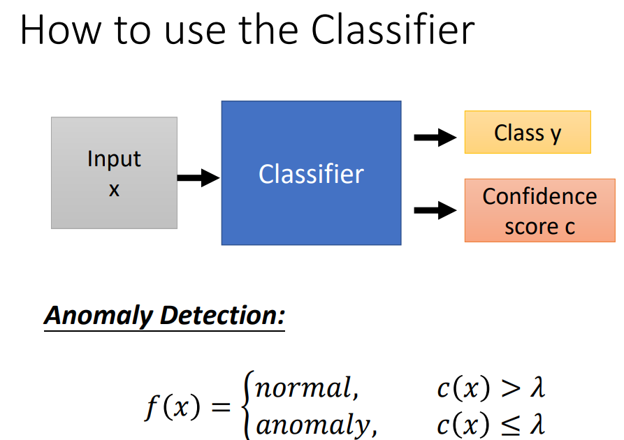下面介绍下有标签的异常侦测,分类器不仅输出类别,还输出了一个信心分数,然后设置了一个阈值,当信心分数大于阈值时就是正常的,当小于阈值时,就是异常的。