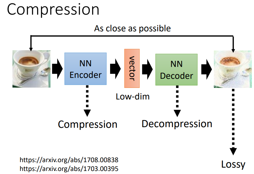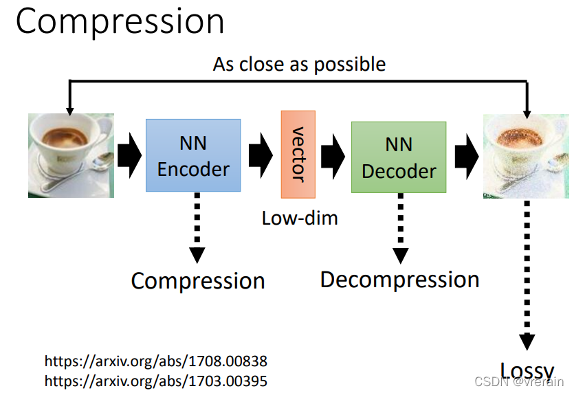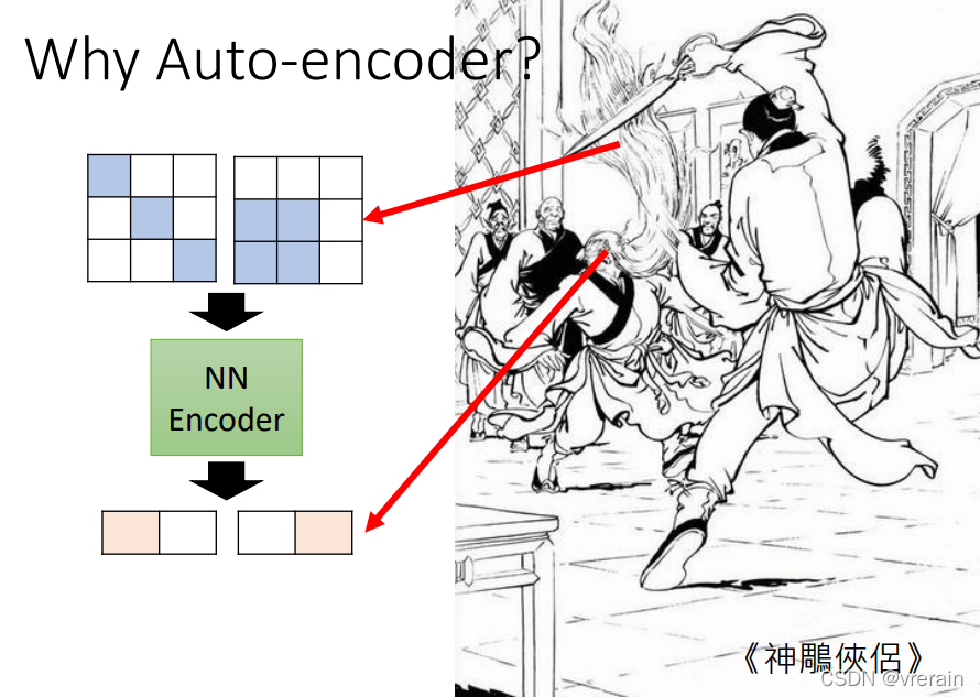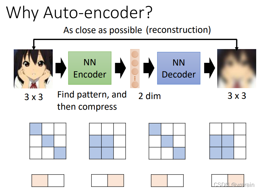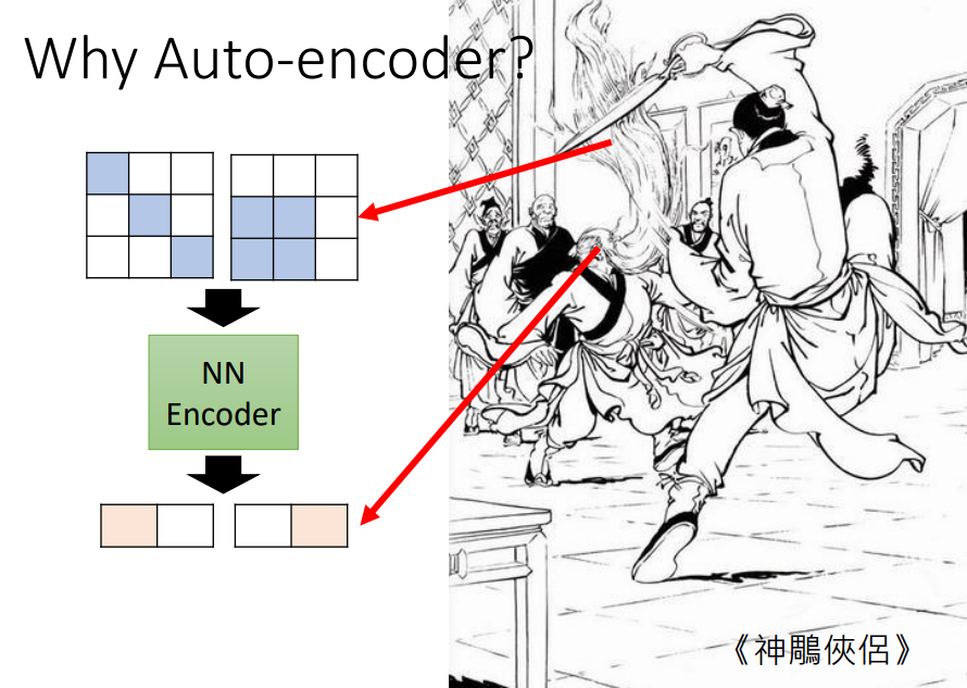 Auto-encoder可以将高维的图片压缩成低维的向量,然后再还原成高维的图片,听起来很不可思议,但是是可以做到的,因为图片的变化是有限的,可能中1的图片就可以用中2的图片来表示,就可以用低维度的向量来表示。同理在低维一些,甚至可以用下1、下2分别来表示输入的高维图片和降维后的向量。