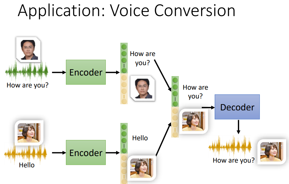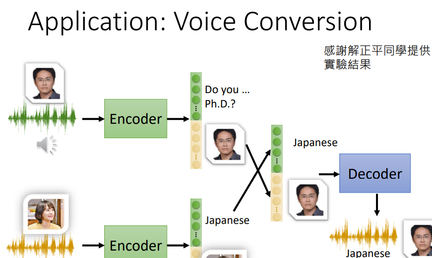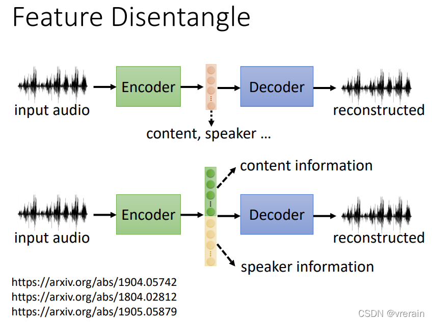 Feature Disentangle技术是指,得到的编码,可以分成几部分,例如input audio,那么编码的前半部分可以表示内容信息。后半部分可以表示说话的人的声音信息。这项技术,有点像柯南的蝴蝶领结,只提取柯南说话中的内容信息,再加上别人说话中的声音信息就可以达到变声的效果。