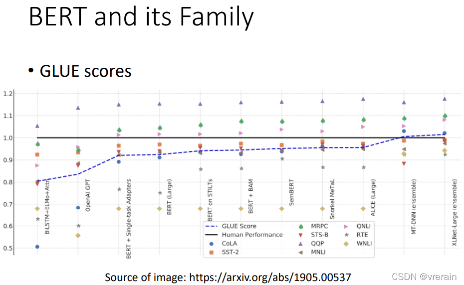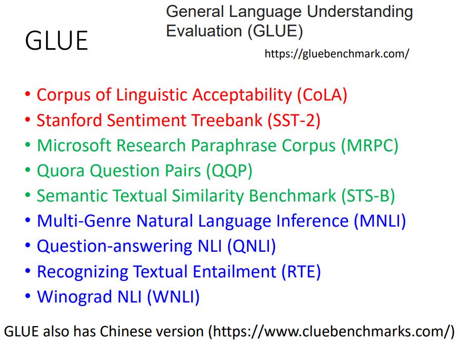 GLUE是自然语言处理的评价指标,其数据规划,体量庞大,并且包含了很多子任务(列表所示),可以较全面的评价模型的性能。