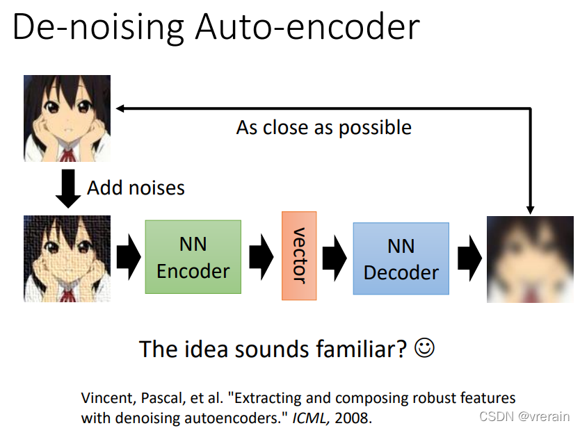 De-noising Auto-encoder是可以去噪声的方法,它必须学会把图片中的噪声去掉,然后才能和原输入图片尽可能的相似。