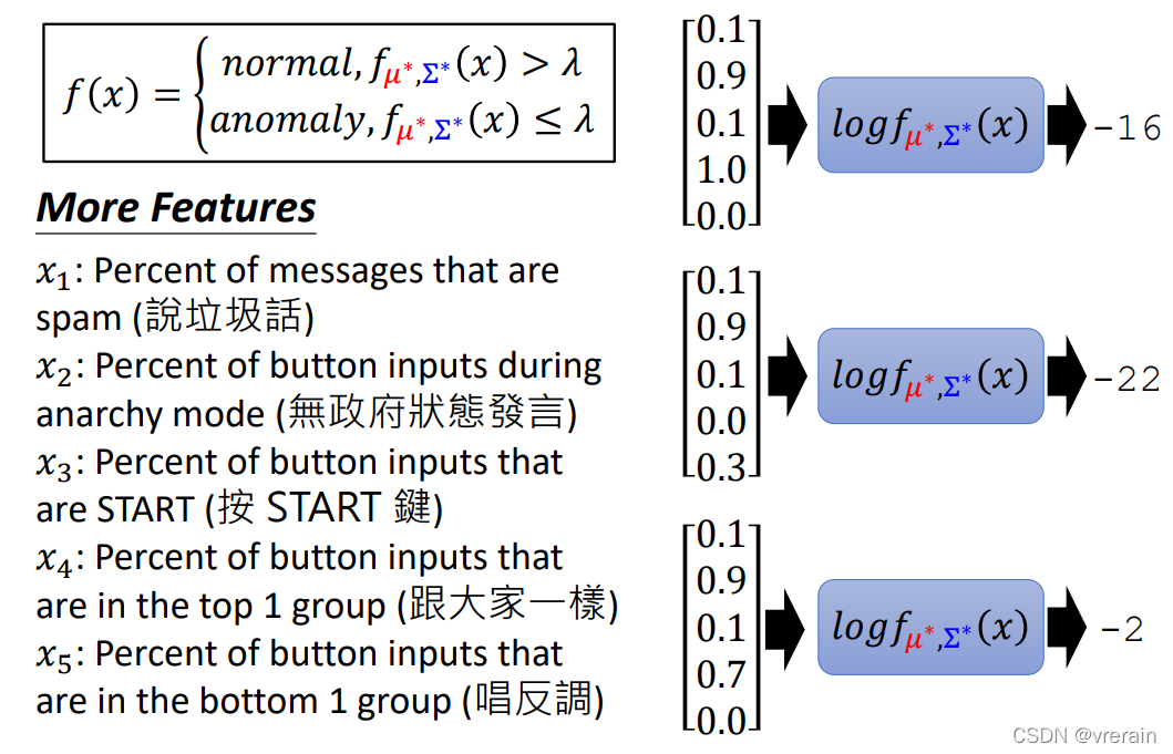 以下是结果,五个特征,结果的每个值代表每个特征的概率,有三个玩家。然后计算每个玩家是否是异常。