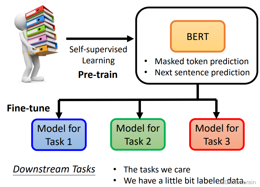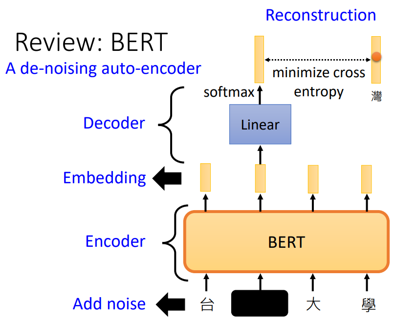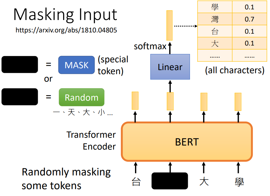 例如使用Masking Input技术进行训练,通过盖住输入数据中的一个字,然后然后模型预测盖住的字是什么。