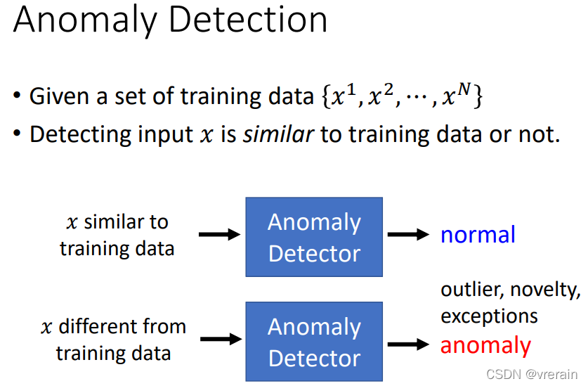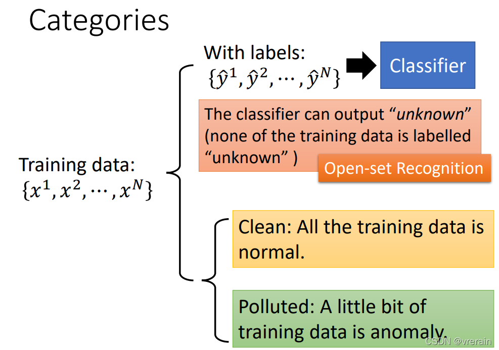 异常检测的分类如下所示,有一堆训练资料,然后分成有标签和无标签两种。