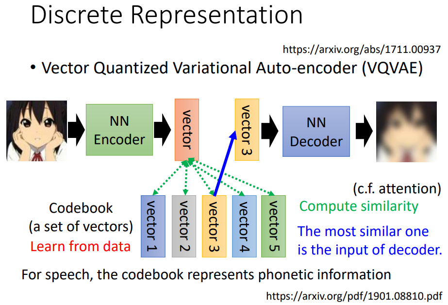 VQVAE通过Encoder得到一个vector,然后和Codebook计算一个相似度,把最像的当作Decoder的输入。如果用于演讲的话,codebook就可以代表音标。