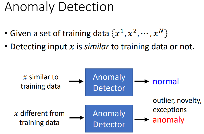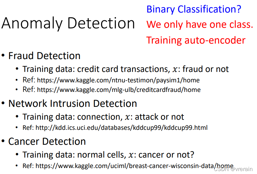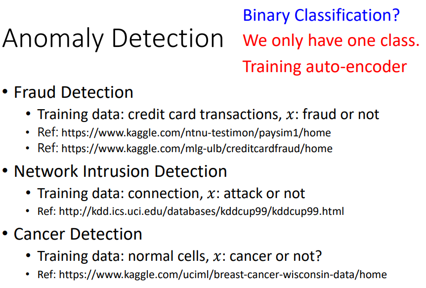 异常检测的一些应用,异常检测的任务不可以用简单的分类器来做,因为异常资料是非常少的,另外异常的类别非常多,所以不适合当成简单的分类任务来做。可以用auto-encoder来做