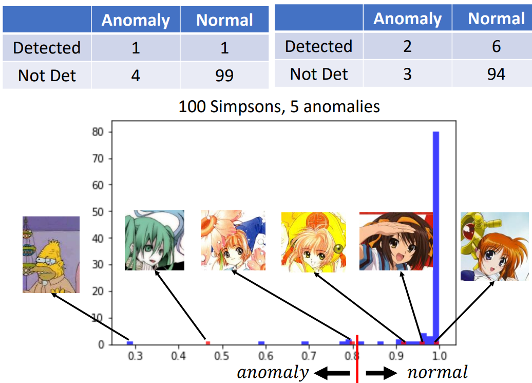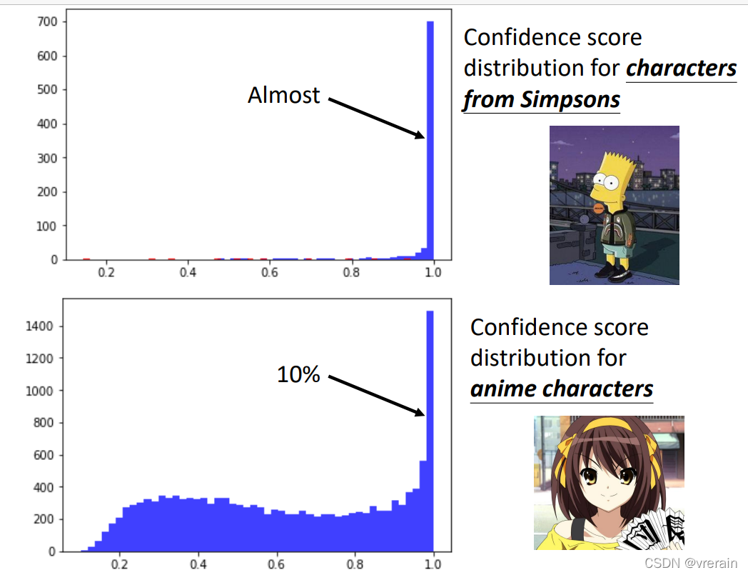 下图展示了辛普森家族图片数据集和不是辛普森家族图片数据集得到的信心分数的分布。可以看出,不是辛普森家族的图片数据集虽然有10%被判定为信心分数很高,但总体来说,还是可以看出异常的。