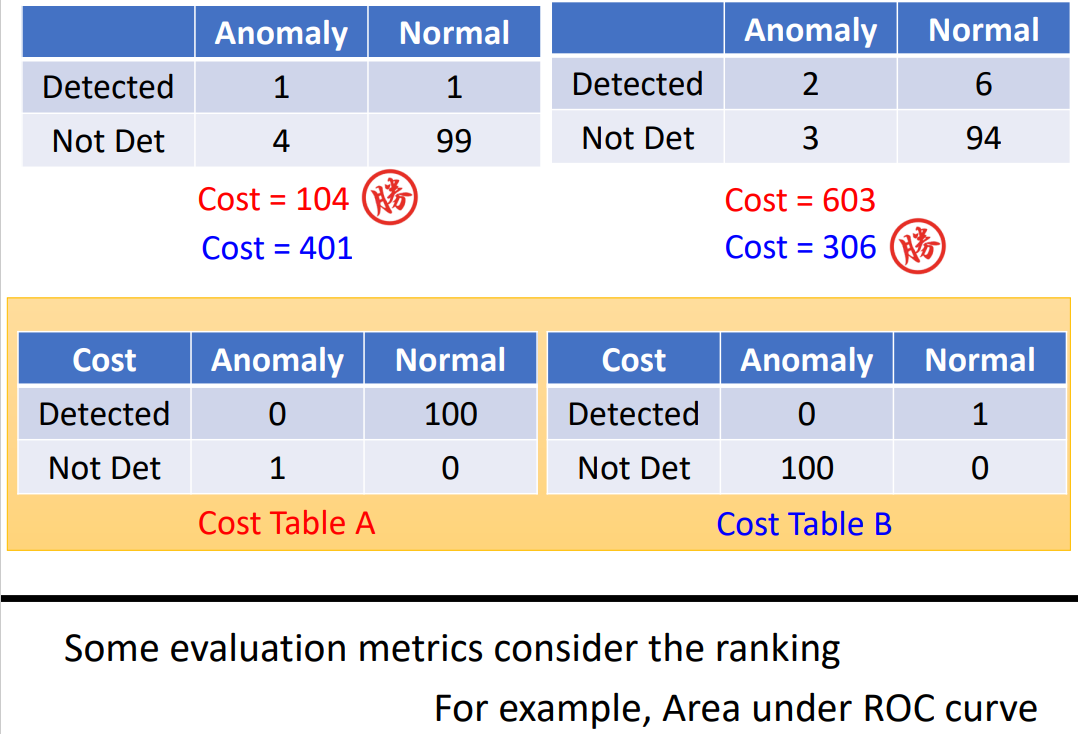 这种分类器评价时,需要一个cost table,以此来增大没有识别出异常的代价。在这种正负样本不均衡的情况时,更常用的评价指标是AUC。