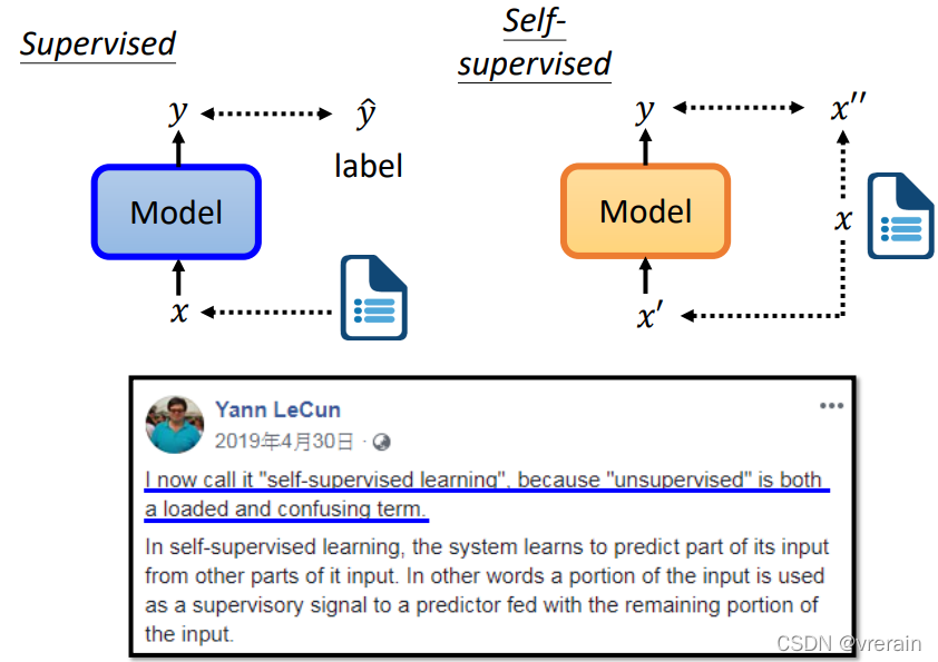 监督学习由数据及其标签进行模型训练。而自监督学习只有数据进行模型训练,也就是说标签不是标注出来的,而是从输入数据中获取到的。
