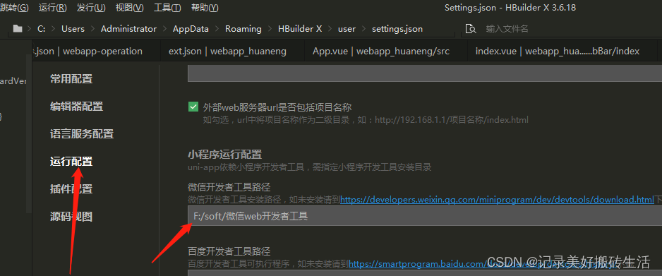 3、在HBuilder中配置,打开工具-设置-运行配置-微信开发者工具路径