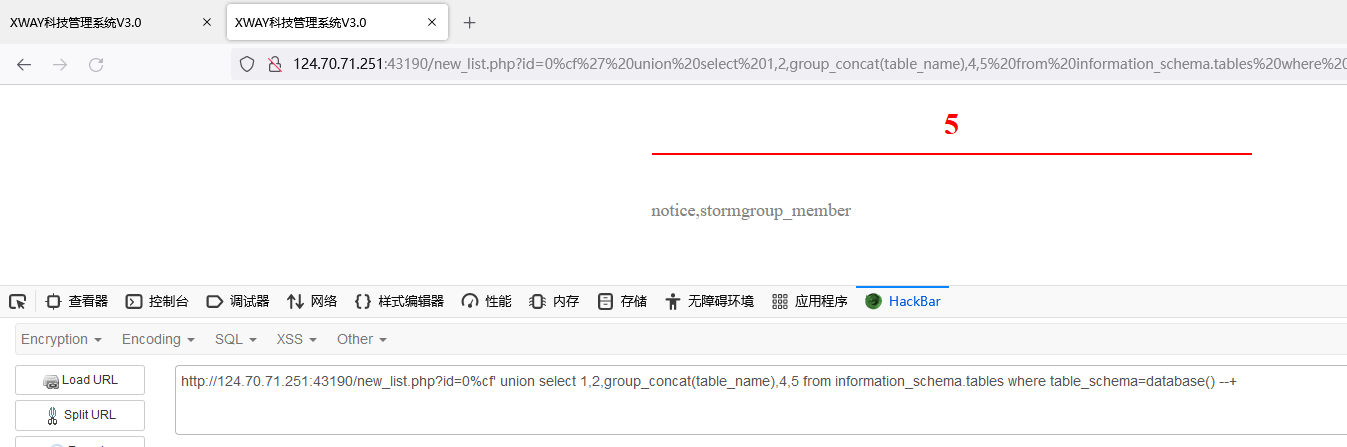 然后判断列数,在第六列的时候显示查询错误,所以判断数据库只有5列数据