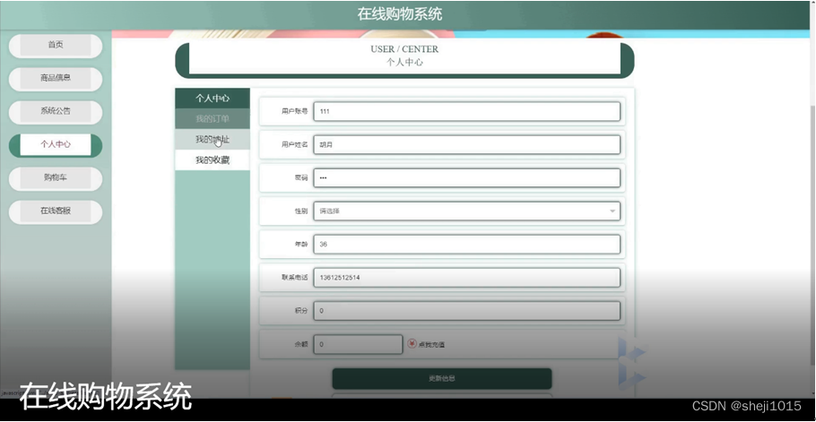 个人中心,在个人中心页面可以对用户账号,用户姓名,密码,性别,年龄,联系电话,积分,余额等内容进行查看,如图5-10所示。