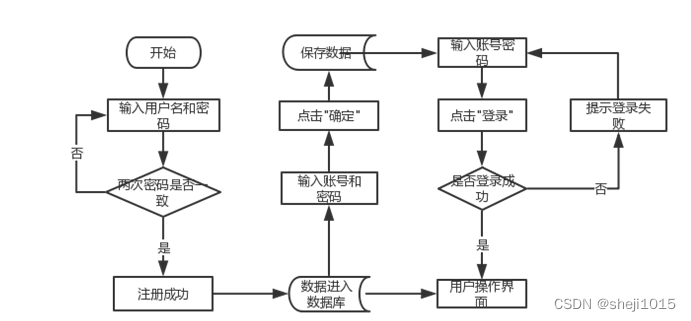 用户要通过填写自己的账号和密码进入系统,如果用户没有登录的账号需要先进行注册用户在注册页面输入账号和密码,点击注册,按要求输入注册表所要的信息,登录密码和确认密码,点击注册后,系统先判断用户输入的“密码”和“确认密码”是否一致,如果不一致,用户需重新输入;如果一致则注册成功,然后输入刚才注册的个人账号和密码点击“登录”按钮。登录注册算法流程图如图4.2登录注册流程图所示。