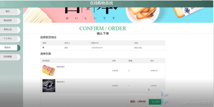 购物车,在购物车页面可以查看收件人,联系方式,收货地址,并对购物车中的商品进行支付,如图5-11所示。