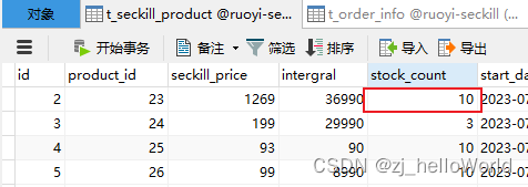 1. 秒杀操作前,数据库秒杀商品表中库存数量为10: