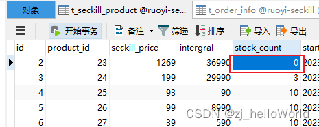 5. 秒杀操作完成后,数据库秒杀商品表中库存数量为0,没有出现超卖的情况: