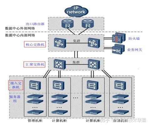 - 接入交换机:一般用于直接连接电脑。通常将网络中直接面向用户连接或访问网络的部分称为接入层。负责连接机柜内部的服务器。