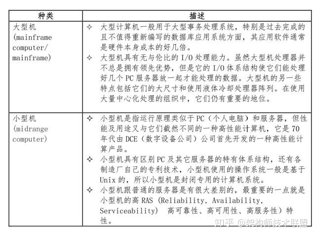 按照服务器体系架构,服务器主要分为非x86服务器和x86两类;非x86服务器包括大型机、小型机和UNIX服务器,它们是使用RISC或EPIC,并且主要采用UNIX和其它专用操作系统,RISC处理器主要包括IBM公司的Power和PowerPC处理器,SUN和富士通合作研发的SPARC处理器。EPIC处理器主要是Intel研发的安腾处理器等。