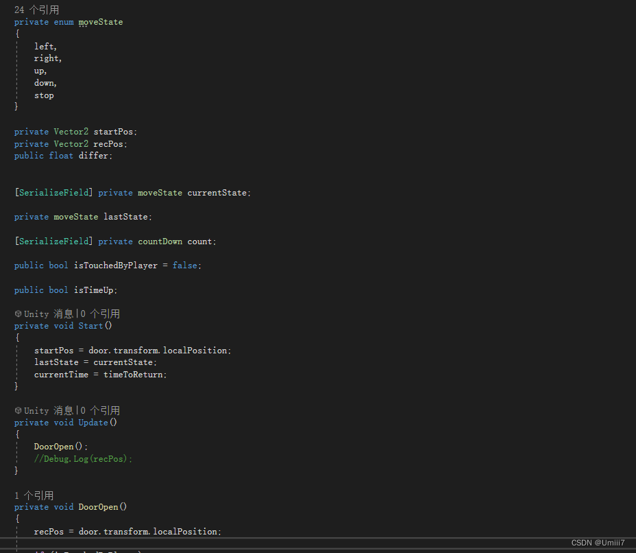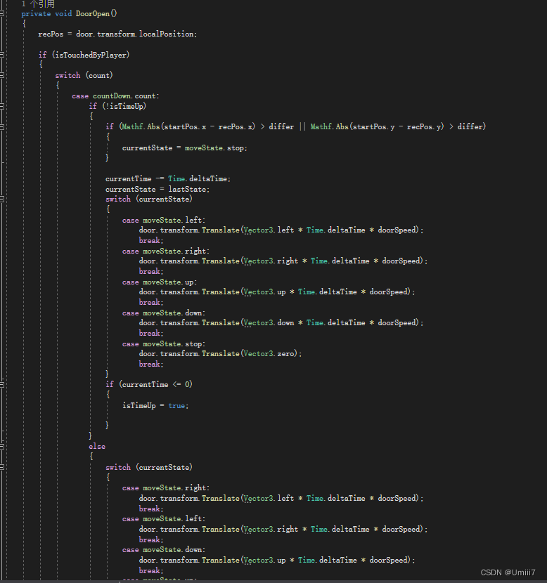 在第一关完成搭建和测试后,我们进行了物理系统相关参数的微调,使其物理表现效果基于弧形三角形的手感有了进一步提升。此后我开始进行陷阱障碍部分代码的迭代,使其能够更加方便的用于场景中,丰富其实用性和复用性。此时距离比赛结束还有十二小时。本人通过枚举和选择嵌套编写的可控计时方向可调距离可调的机关门部分代码如下: