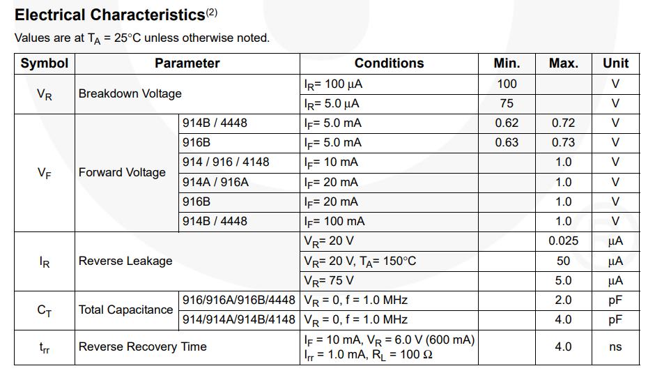 先说下二极管,普通二极管在使用过程中一般没什么特别需要注意的,在集成元件的集成度越来越高的今天,用上普通二极管的地方也并不多。普通二极管在使用的时候需要注意一点,就是它会导致压降,不同二极管压降不一样,硅二极管和锗二极管的压降不一样。硅管会高一点,典型值是0.7V,锗二极管典型值是0.5V。拿较为常用的1N4148举个例子,我随便找了一个厂商的1N4148的数据手册,如下图