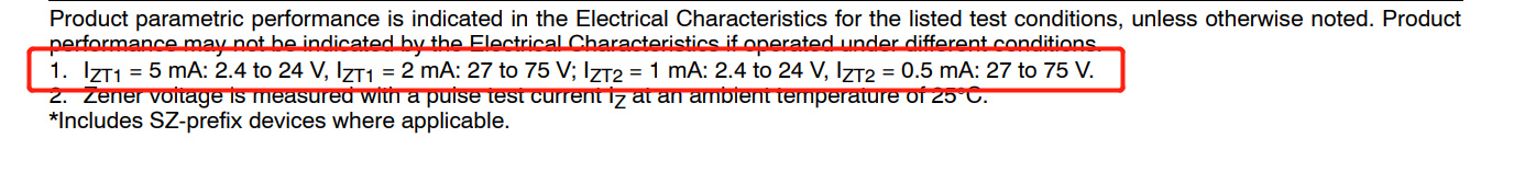 稳压管其实需要关注的参数不多,理论上,仅需关注Vz和Izt即可,Vz就是稳压管击穿后两端的电压值,一般来说,稳压管命名就会包含这个参数。Izt是稳压管击穿时的电流需求,因为我们一般使用稳压管就是为了钳制电压,加在稳压管的电压肯定大于Vz,肯定达到了击穿要求,所以Izt我们一般不太在意。也是因为此,这个系列稳压管的Izt参数放在一个旮旯里面。如下图