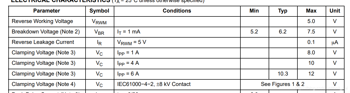 可以看到,TVS管的伏安特性曲线上,参数比稳压管的要多。先说Vbr,这个参数就是TVS管发生击穿的阈值,也就是说,正常来说,加在TVS管两端的电压肯定不能大于这个电压,那小于这个电压就可以了吗?实际使用时,并不是,我们真正考虑的安全电压时Vrwm,Vrwm是一个小于1的系数乘以Vbr得来的值,Vrwm需要大于或等与电路正常工作时加在TVS管两端的电压。为什么有了Vbr还要使用Vrwm?我个人理解是,出于制造工艺和使用安全性(TVS管一般不能工作,即需要出于截止状态),所以制定了这个参数。打个比方,比如我们一张桌子,结构和材质理论上可以承受100Kg,但是因为生产工艺无法控制的一模一样,出于大规模生产后安全使用的考虑,就标注最大承重80Kg,这样无论哪种桌子,再差也不会被80kg的重量压垮。
