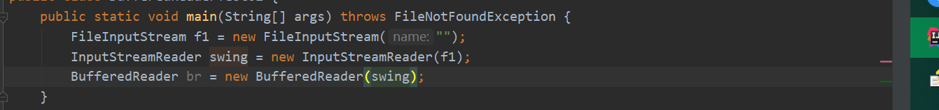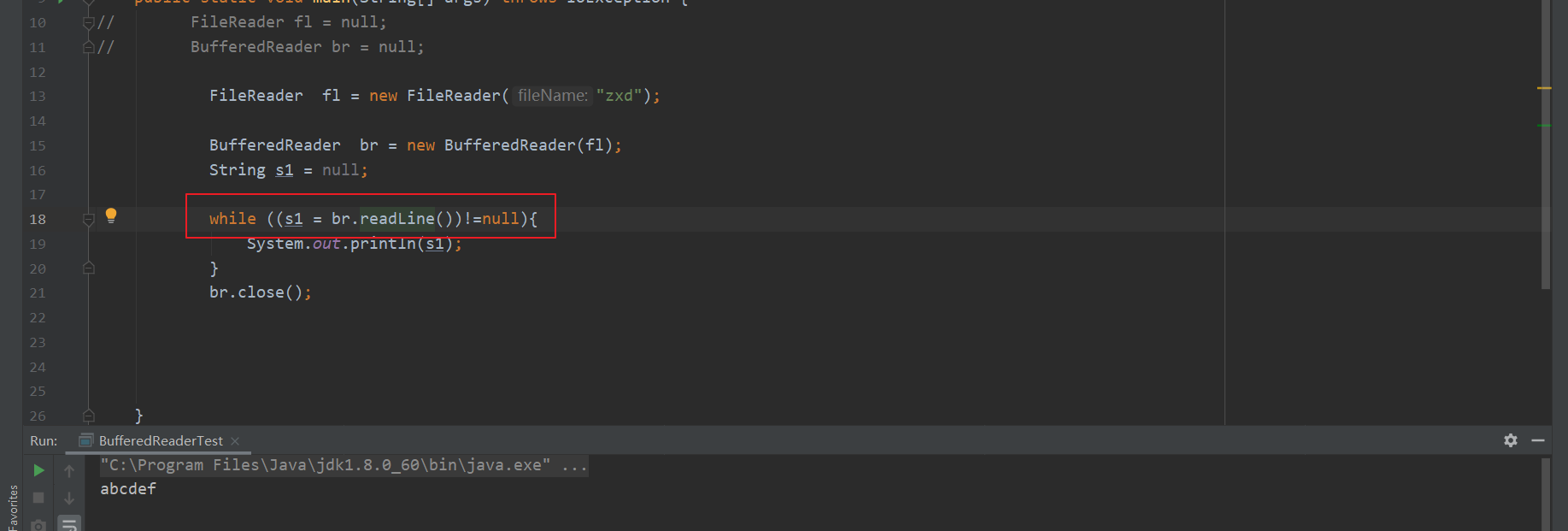 FileReader reader = new FileReader("zxd");/**/BufferedReader br = new BufferedReader(reader);String s1 =br.readLine();System.out.println(s1);/*关闭流*/br.close();