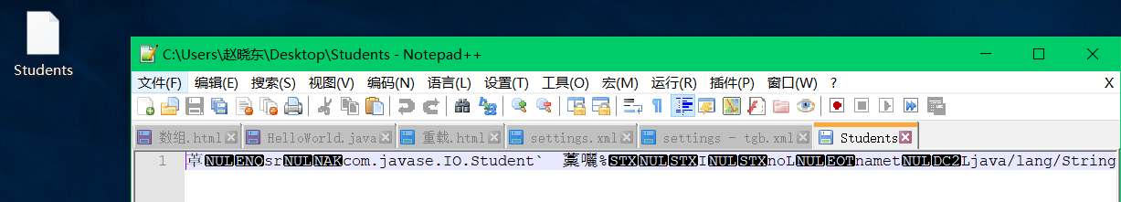 public static void main(String[] args) throws Exception{/*进行序列化例子*/Student s1 = new Student(1,"赵晓东");/*通过流去给一个文件students为文件的名字*/FileOutputStream f1 = new FileOutputStream("Students");/*调用ObjectOutputStream*/ObjectOutputStream o1 = new ObjectOutputStream(f1);/*调用方法进行序列化*/o1.writeObject(s1);/*刷新*/o1.flush();/*关闭流*/o1.close();}