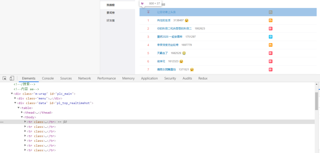 $("#pl_top_realtimehot table tbody tr").each(function (index) {if (index !== 0) {const $td = $(this).children().eq(1);const link = weiboURL + $td.find("a").attr("href");const text = $td.find("a").text();const hotValue = $td.find("span").text();const icon = $td.find("img").attr("src")? "https:" + $td.find("img").attr("src"): "";hotList.push({index,link,text,hotValue,icon,});}