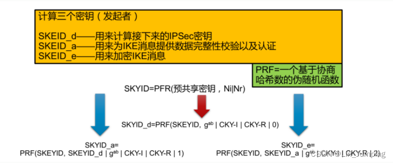 对等体间通过DH算法交换彼此的密钥生成所需的参数信息,建立两端相同的一系列共享密钥,认证密钥用于在IKE第二阶段协商中为信道中传输的协商数据(非用户数据)进行认证;加密密钥用于在IKE第二阶段协商中为信道中传输的协商数据进行加密