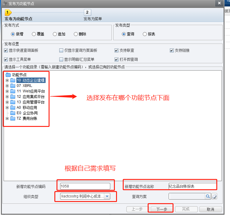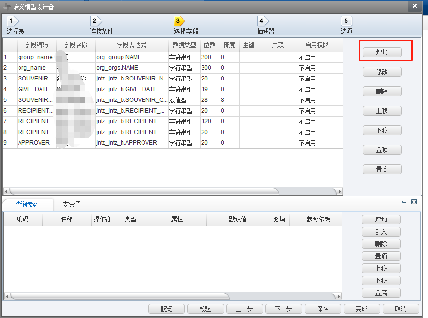 添加报表显示哪些字段,然后点击【保存】、再点击【完成】