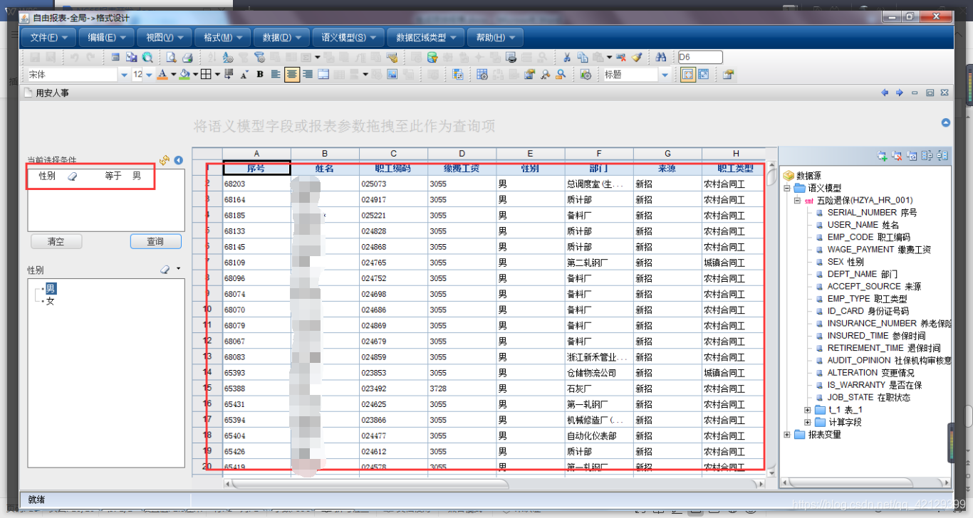 8、点击【格式设计】进入自由报表设计界面,点击【数据源】选择创建好的HZYA_HR_001语义模型