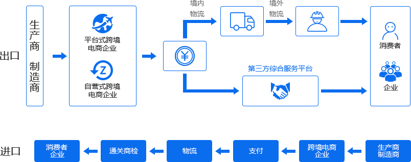 从跨境电商的出口流程看,生产商或制造商将生产的商品在跨境电商企业的的平台上展示,在商品被选购下单并完成支付后跨境电商企业将商品交付给物流企业进行投递,经过两次(出口国和进口国)海关通过商检后,最终送达消费者或企业手中。也有的跨境电商企业直接与第三方综合服务平台合作,让第三方服务平台代办物流、通过商检等系列环节从而完成整个跨境电商的交易过程。跨境电商进口流程除了与出口流程的方向相反外,其他内容基本相同