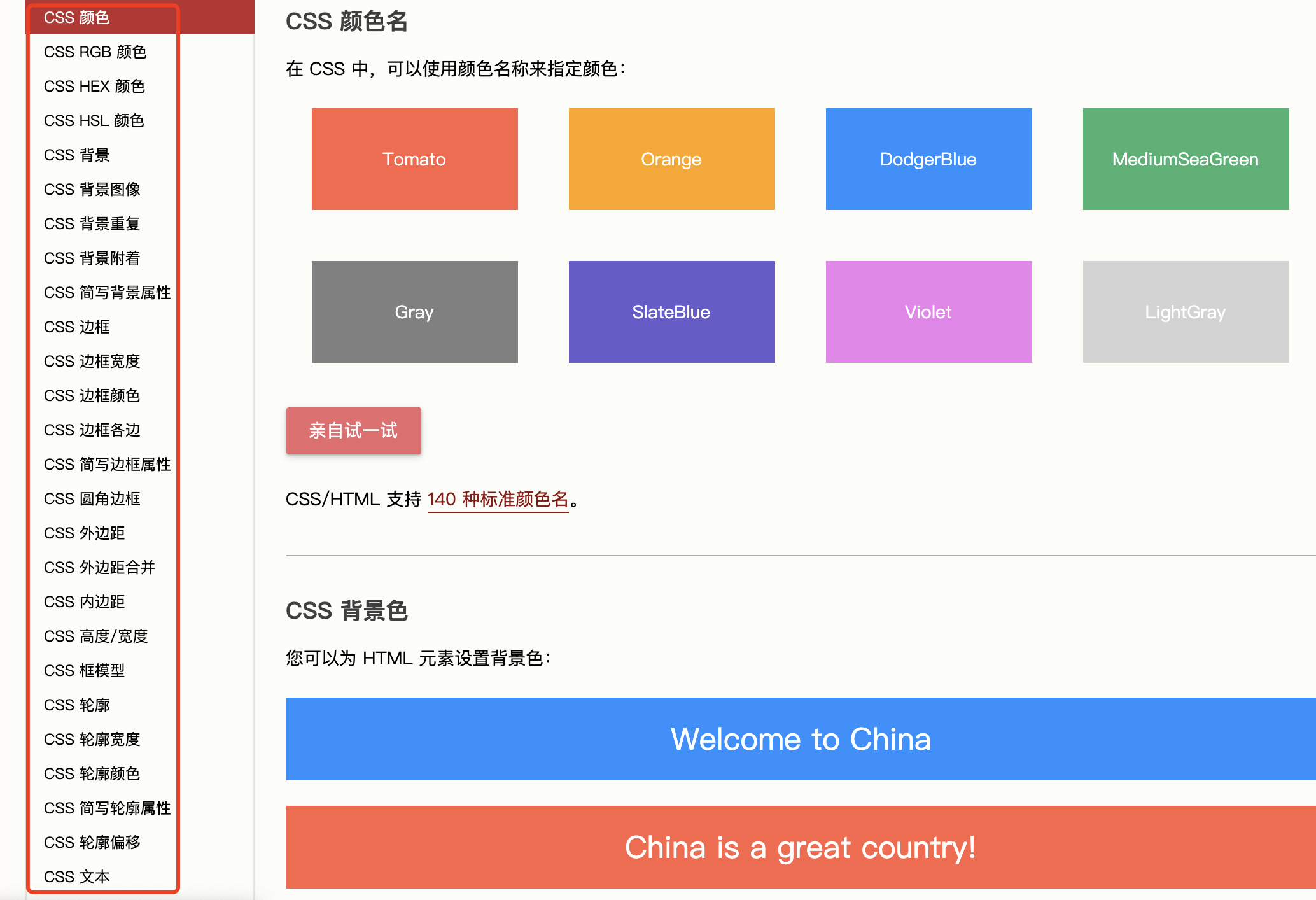 从这个教程可以看到css可以定义的属性。包括颜色,背景色和边距,边框等。