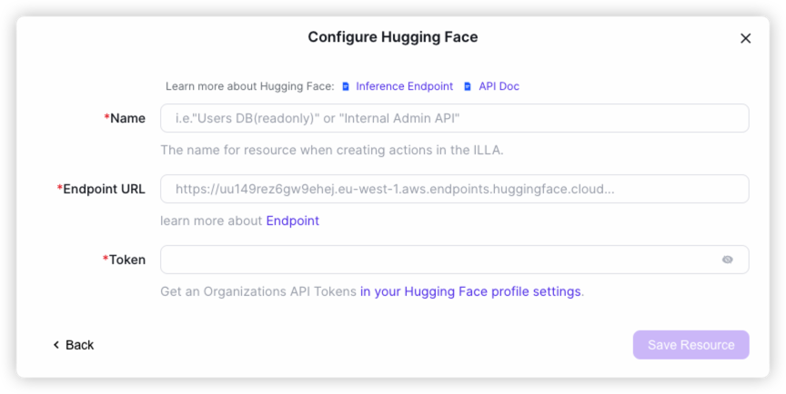 为了添加 Hugging Face 资源,请按如下要求填写必填字段: