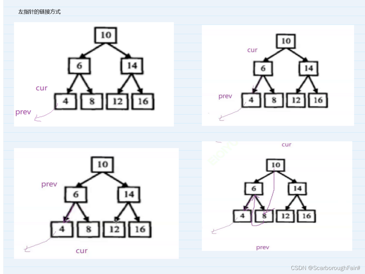 public:void InOrderConvert(TreeNode* cur,TreeNode*& prev){if(cur == nullptr)return;InOrderConvert(cur->left,prev);cur->left = prev;if(prev)prev->right = cur;prev = cur;InOrderConvert(cur->right,prev);}TreeNode* Convert(TreeNode* pRootOfTree) {if(pRootOfTree == nullptr)return nullptr;TreeNode* prev = nullptr;InOrderConvert(pRootOfTree,prev);TreeNode* head = pRootOfTree;while(head->left)head = head->left;return head;}