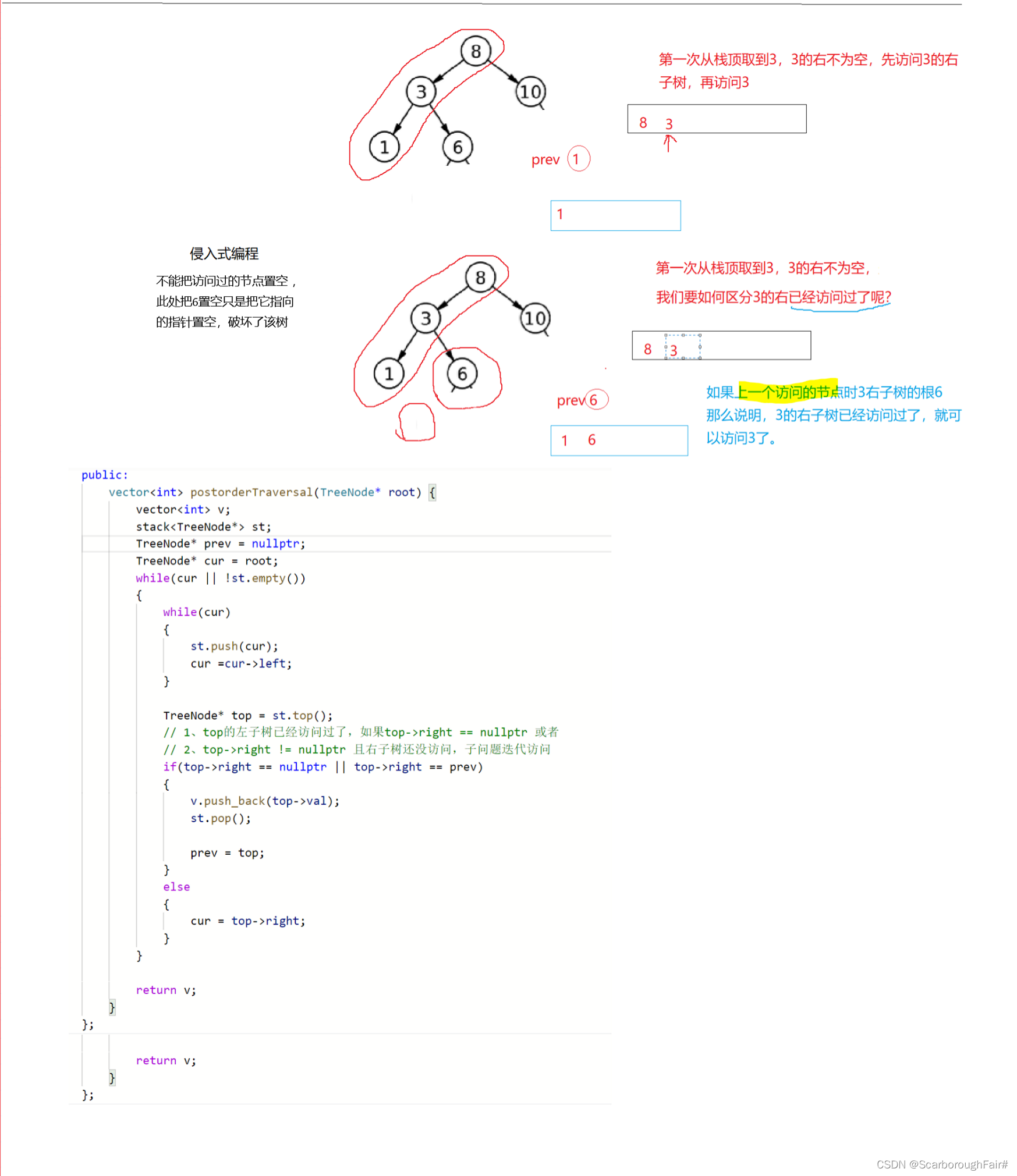 public:vector postorderTraversal(TreeNode* root) {vector v;stack st;TreeNode*prev = nullptr;TreeNode* cur = root;while(cur || !st.empty()){while(cur){st.push(cur);cur = cur->left;}TreeNode* top = st.top();if(top->right == nullptr || top->right == prev){v.push_back(top->val);st.pop();prev = top;}else{cur = top->right;}}return v;}