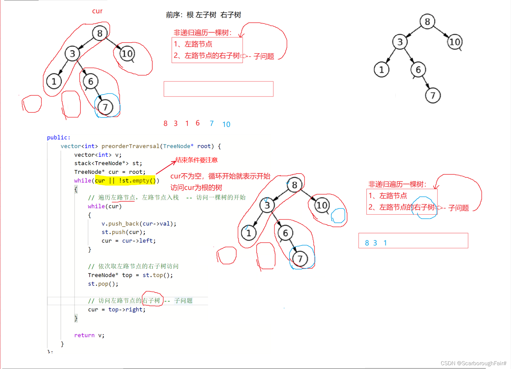public:vector preorderTraversal(TreeNode* root) {vector v;stack st;TreeNode* cur = root;while(cur||!st.empty()){while(cur){v.push_back(cur->val);st.push(cur);cur = cur->left;}TreeNode* top = st.top();st.pop();cur = top->right;}return v;}