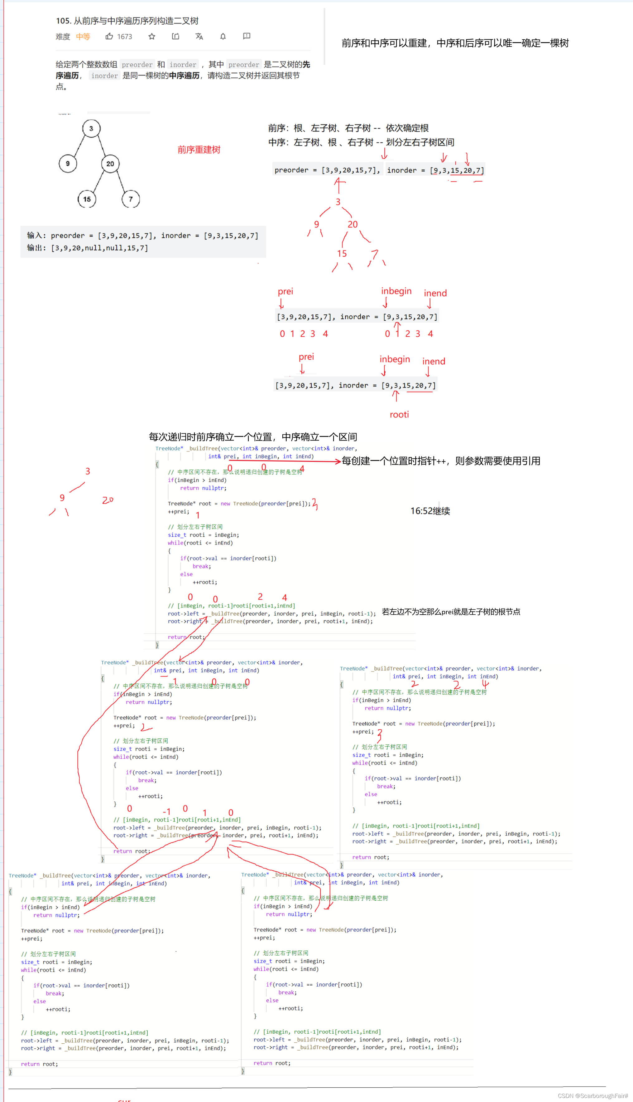 public:TreeNode* _buildTree(vector& preorder, vector& inorder,int& prei,int inBegin,int inEnd) {if(inBegin>inEnd)return nullptr;TreeNode* root = new TreeNode(preorder[prei]);++prei;size_t rooti = inBegin;while(rooti<=inEnd){if(root->val == inorder[rooti])break;else++rooti;}root->left = _buildTree(preorder,inorder,prei,inBegin,rooti-1);root->right = _buildTree(preorder,inorder,prei,rooti+1,inEnd);return root;}TreeNode* buildTree(vector&preorder,vector&inorder){int prei = 0,inBegin = 0,inEnd = inorder.size()-1;return _buildTree(preorder,inorder,prei,inBegin,inEnd);}