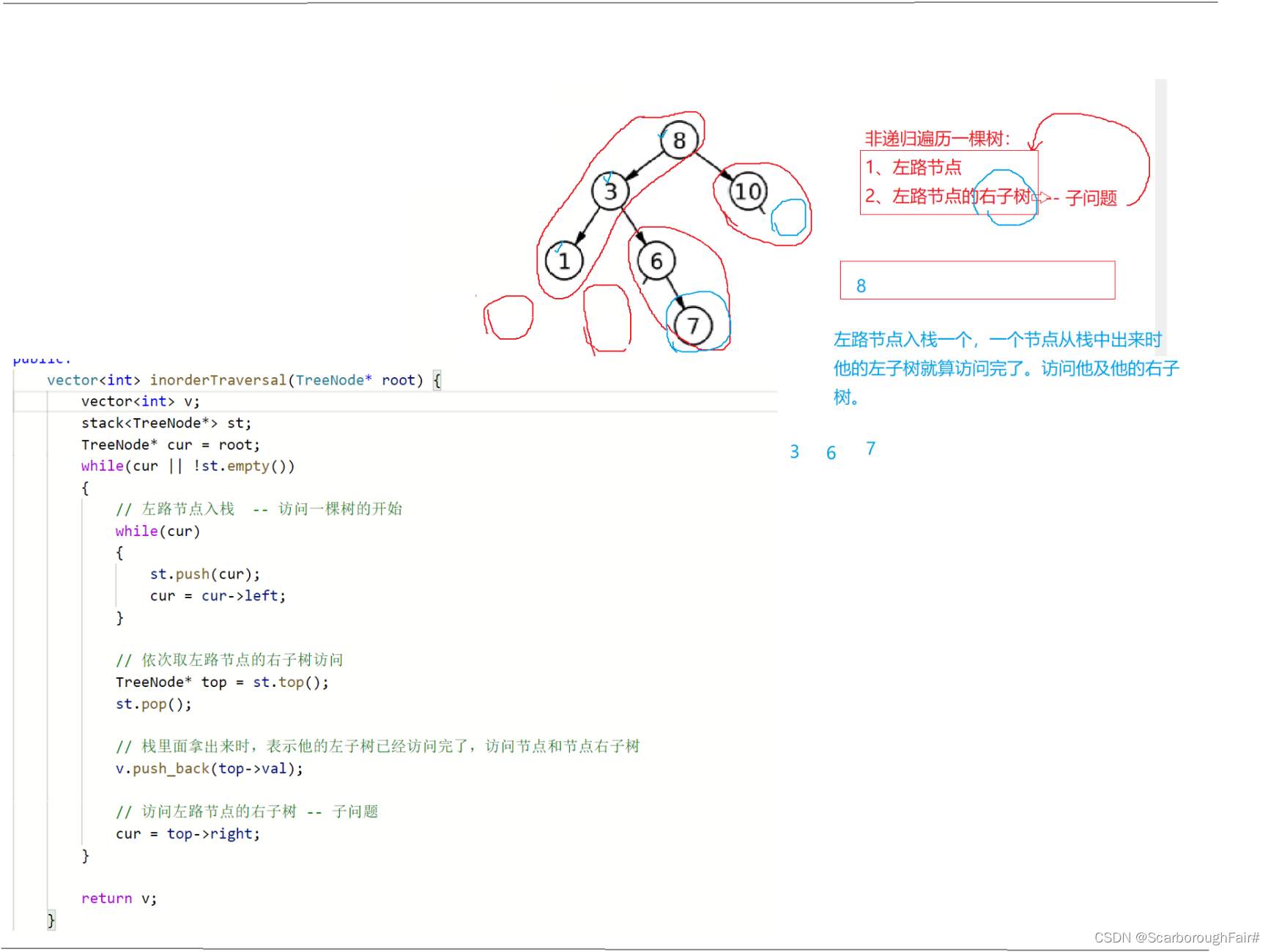 public:vector inorderTraversal(TreeNode* root) {vector v;stackst;TreeNode* cur = root;while(cur || !st.empty()){while(cur){st.push(cur);cur = cur->left;}TreeNode* top = st.top();st.pop();v.push_back(top->val);cur = top->right;}return v;}