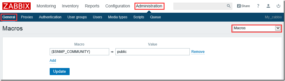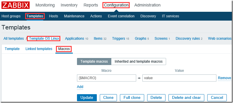 Zabbix宏的作用是便于在模板、Items、Trigger中的引用,名称为{$名称},宏的字符范围为:A~Z/0~9/_。