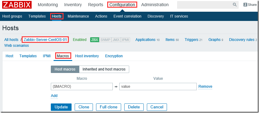 配置步骤:Configuration---->Hosts---->Zabbix server---->Macros