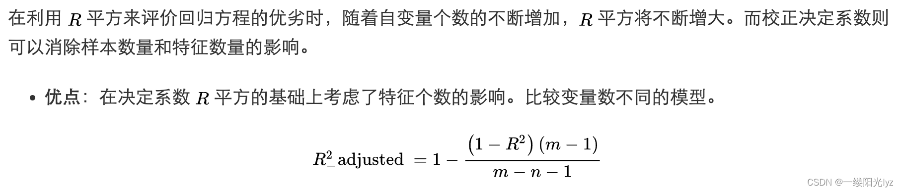 校正之后的决定系数在此基础上消除了样本数量和特征数量的影响,自变量越多,校正决定系数就会对自变量进行处罚,所以一般校正决定系数小于决定系数,它能更好地反映模型的质量,可以用来选择不同特征数量的回归模型。